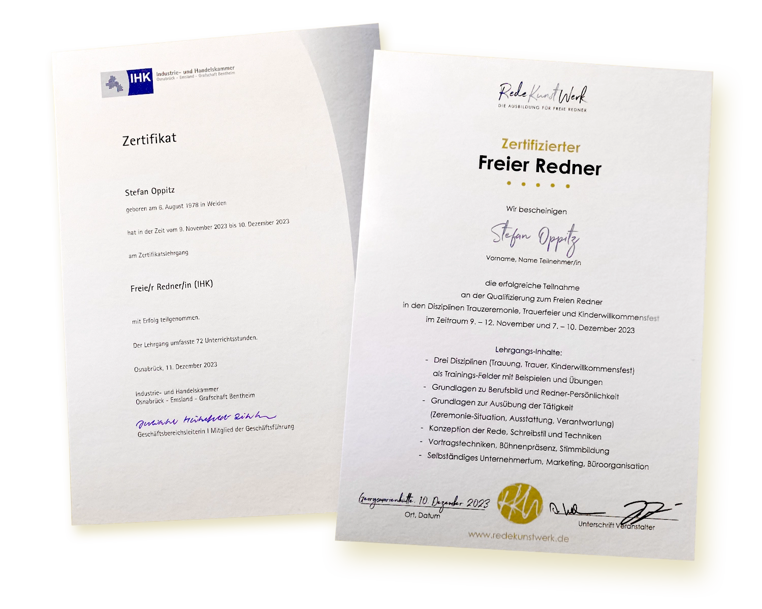 Sehr hohen Wert lege ich darauf, mich fort- und weiterzubilden, um Euch ein sicheres Gefühl zu geben. Beim RedeKunstWerk durfte ich eine wunderbare und professionelle Ausbildung genießen, die mich auf meinem Weg zum freien Redner bestens vorbereitet hat. Hierbei war es für mich maßgebend, diese Ausbildung in Präsenz durchzuführen. Nur im persönlichen Kontakt entwickelt sich das so wichtige Gespür füreinander. Auf die Weise können Emotionalität, Tiefe, Mimik und Gestik richtig gedeutet werden und in die Gestaltung einer passenden Rede einfließen. Nach Ausbildungsende wurde mir der erfolgreiche Abschluss zertifiziert.